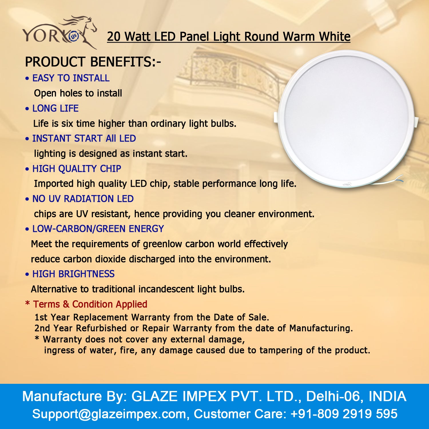 YORKUS LED Presents export quality internationally certified by AIAO-America, using fast and advanced technology with extra features such as Imported semiconductors and Instant Start light-emitting diode (LED). High surge-protected integrated circuits, up to 2KVA. gives long life 6 times higher than ordinary light bulbs. LED Chips are UV resistant hence providing you with a clean environment. High brightness alternative to traditional LED light bulbs. Easy to Install-Open holes to install Decorative design makes your kingdom light & bright
