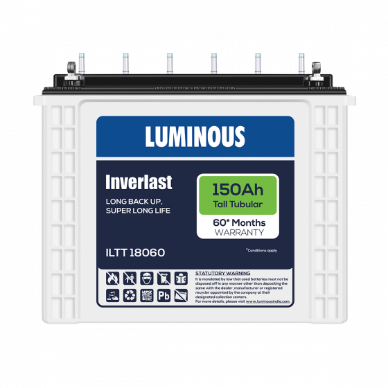 If you are searching for an ILTT 18060 150Ah Battery, then the Luminous Inverlast 150ah ILTT 18060 tall tubular battery will be an excellent choice for you. Unlike other brands, Luminous is known for making high-end inverters and batteries that are durable and extremely practical. ILTT 18060 150Ah Inverlast Battery The tall tubular battery range is next-generation tall tubular batteries, which are designed to withstand long and frequent power outages. The latest specially designed tall tubular batteries with thick tubular plates are best suited for areas with frequent power outages. These long-lasting batteries have 30% more acid volume per amp hour than ordinary tubular batteries. These batteries can also better withstand overcharging. Its superior features have made it the most popular UPS battery.